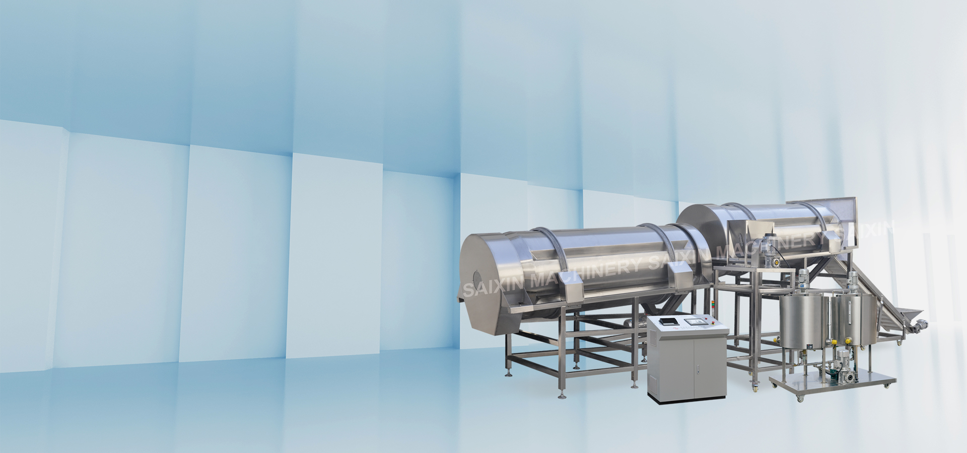 3. 双滚筒用于先在滚筒的进料端喷油,之后再在表面撒调味料,要求油料分离的情况,适合生产高档产品。